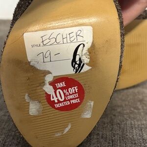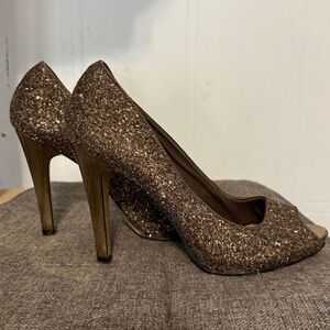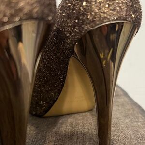 These heels are so cool. Only worn once. The whole shoe is sparkly, while the heel itself is mirrored. Sort of a brown/copper/bronze color. Easy to dress up and down. Great for events. There's a scuff on one of the heels (pictured).