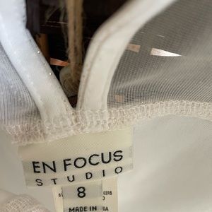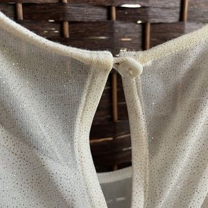 Ivory colored dress with gold sparkles throughout with lining underneath. Very lovely evening dress, only worn once, size 8, So much prettier in person! 100% polyester.
