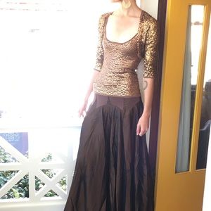 This is a 3 piece set: included is a gold/bronze colored shrug by bebe, a sequined tank top by bebe, and floor length skirt by Magdalena. All items are in excellent condition with no flaws and all items fit a small/XS (the shrug and skirt are a size small and the top is an XS). Made of cotton knit and sequence bronze toned.
