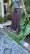 this is a stretch fabric basically black with a purple glitter is the best way to describe it sprinkled throughout. One gets a feeling of a dark floral. The skirt is cut a symmetric, but it has a ruffled him evening the pattern out that waste will stretch easily to 17 inches in excellent condition.