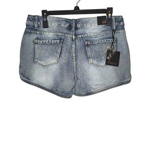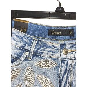 The shorts also have a slightly distressed look, with some fading and whiskering throughout the denim. The brand "Sparkle" is visible on the inner waistband label and the size "13." These shorts are a fashionable and eye-catching piece, suitable for casual wear or dressing up for a night out.