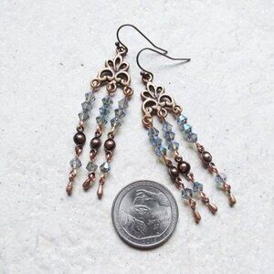 Materials Used: gorgeous semi-transparent blue colored faceted bicones, copper bead connector + tassel ends; feminine copper connector plate, copper hypoallergenic coated earwires. Lightweight & App. 2.5" long.