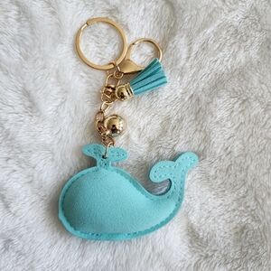 Charming blue whale soft keychain with rhinestones and gold accents. Features a tassel and sparkling details.