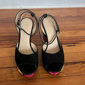 These Botkier Jesse platform wedge sandals are just as stylish as they are fun. They are brand new without box and never worn. I love the black sparkling wedge and adjustable ankle straps, but the best feature is the embroidered raffia flowers in green, blue, yellow, pink, and orange. The colors really pop against the black background. They’re sure to be a great addition to your spring and summer wardrobe. Original plastic on the bottom of the shoes. Runs about a size small.