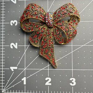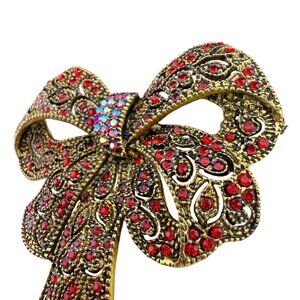This elegant bow brooch features intricate gold-tone metalwork inlaid with stunning red rhinestones and an iridescent accent at the center. A dazzling statement accessory for any occasion.