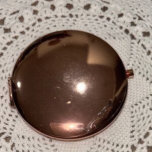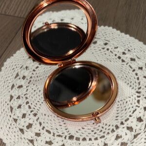 Round compact mirror with sparkling design. Features rose gold and silver accents.