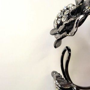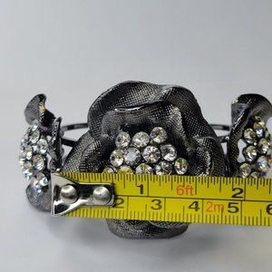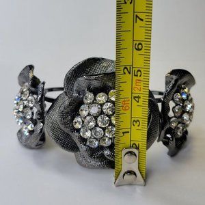 In a hematite tone, this gorgeous hinge cuff bracelet bangle is adorned with 3 double layered petals with a stunning cluster of sparkling crystals in the middle