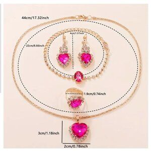 Sparkling Crystal Red Heart Jewelry Set Necklace Earrings Bracelet Ring Gold Ton