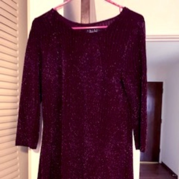 This is a beautiful evening dress but also could be worn out during the day to a nice affair. The color is a gorgeous purple with sparkle! Never been worn