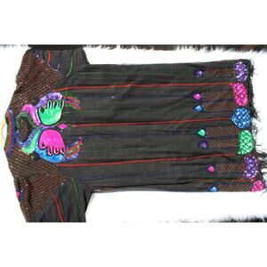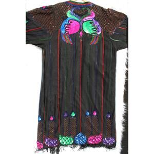 It is 100% silk outer, beautiful bead and sequin work all up and down. It's very clean. I've seen these described as dusters, robes, opera robes. It's extremely unique.