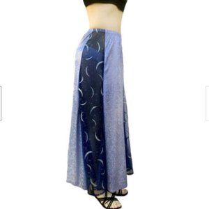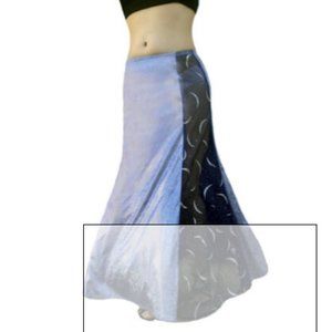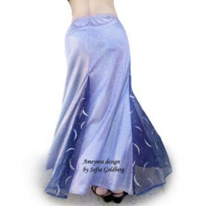 Sparkly polyester skirt with sheer mesh inserts. For dance, carnival, or for making cosplay costume. New. Handcrafted by my Ameynra family member. Skirt has elastic waistband that stretches well to fit. Skirt is made from soft spandex polyester with is stretchy a little bit. Mesh inserts have silver moons print on each of those 3. Skirt is one of a kind.