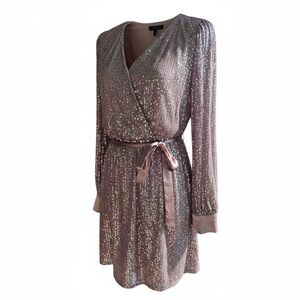Shimmering sequin wrap dress with a satin belt. Perfect for parties and special occasions.