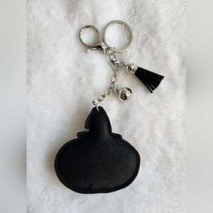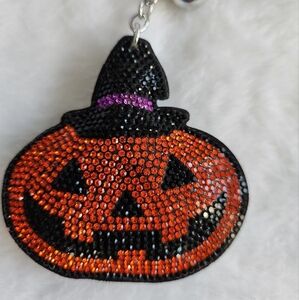 Glittery soft pumpkin keychain with a black tassel. Features orange, black, and purple rhinestones. Perfect as a bag, purse, tote, or bookbag charm.