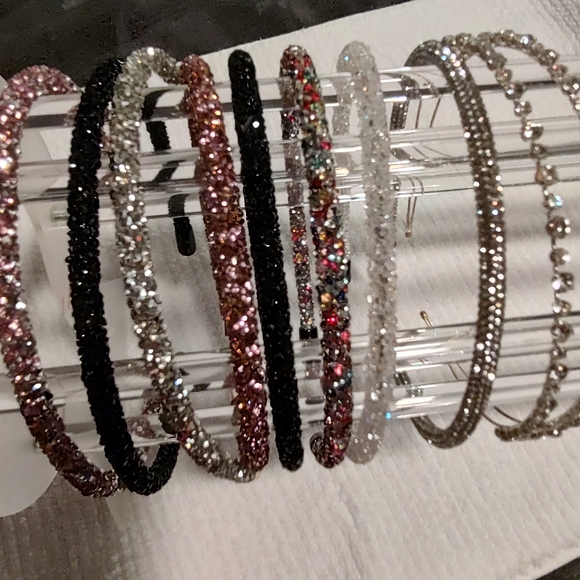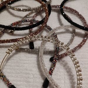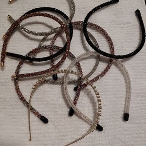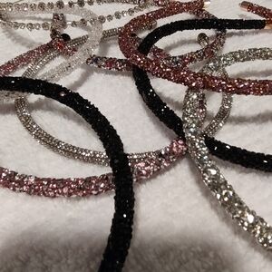 Set of sparkling rhinestone headbands in black, silver, multi, rhinestone, clear and pink. They are thin and very sparkly. Perfect for adding a touch of glamour.