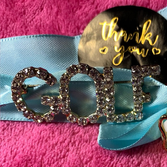 This charming accessory set features a sparkling golf theme, perfect for sports enthusiasts. The a dazzling gold and silver golf bag pin, adding a touch of elegance to any outfit. Golf bag sold separately, see my closet. Ideal for gifting.