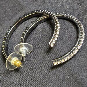 Classic and eye-catching smokey silver tone rhinestone hoop earrings with rows of clear crystals that shimmer beautifully in the light. These hoops are perfect for adding just the right touch of sparkle — ideal for everyday glam, evening wear, or special occasions.