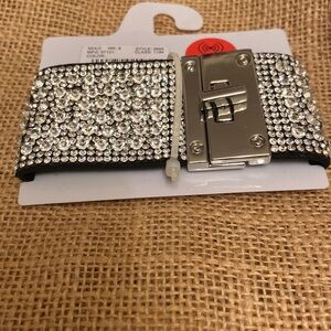 Sparkling Clear Color Rhinestones with Silver Twist Lock for closure Wide Band Wrist Bracelet. Has not been worn and has security cable intact. Inside has soft feel to not irritate the skin. Fits most regular size wrists.