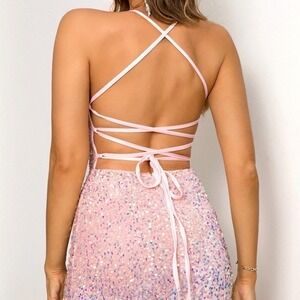 This pink sequin mini dress is the perfect statement piece for any occasion. The contrast sequin detailing adds a touch of glamour and dazzle, while the halter neck design enhances your curves and draws attention to your shoulders. The lace-up back and backless style bring a touch of sensuality and sophistication to the dress, making it the perfect choice for an evening event or special occasion. The dress is made from high-quality materials, ensuring a comfortable fit and a stunning look that will make you the center of attention. Whether you’re going to a party, a wedding, or a night out on the town, this dress is sure to turn heads and make you feel confident and beautiful. Order now and experience the glamour and elegance of this stunning pink sequin mini dress.