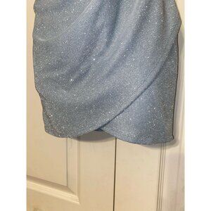 This stunning sparkling mini dress radiates elegance with its silver glitter fabric that captures the light beautifully. Featuring delicate spaghetti straps and a chic draped design, this dress is an exquisite choice for evening occasions. The fitted silhouette complements the figure, ensuring a graceful appearance that's both modern and timeless.