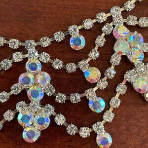 Multi-strand rhinestone bib necklace. Features shimmering iridescent stones that catch light beautifully, creating a rainbow sparkle effect. Perfect for weddings, formal events, prom, pageants, or adding a bold touch to evening wear.