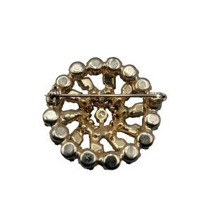 This sparkling unsigned rhinestone brooch features an array of brown, clear, and green stones. Its timeless design adds a touch of elegance to any outfit.