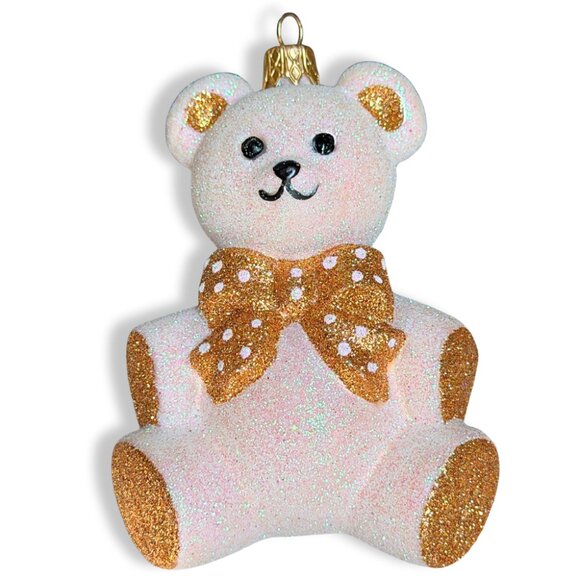 Sparkling White Gold Glass Teddy Bear Christmas Ornament Glittery Heirloom Decor