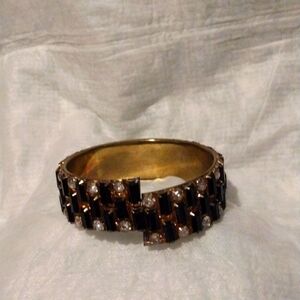 This is a beautiful bangle adorned with faceted round clear rhinestones as well as oblong black ones. All are prong set on a solid split metal bañgle. The split allows for a little "give" to the opening. Inside diameter is 2 3/4" and the width is 1". A real statement bracelet! Thanks for looking! As always, I will be happy to consider reasonable offers.