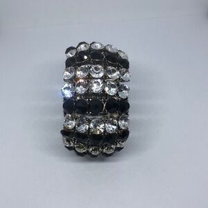 Black and clear rhinestones nice heavy duty bracelet. While stretchy would fit around 7.25-7.5 best, give or take a little.