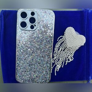 This stunning phone case is designed for the iPhone 16 Plus, featuring a glittery silver background that shimmers and catches the light. The highlight of this case is a dazzling heart-shaped embellishment adorned with rhinestones, with long, cascading tassels adding a touch of glamour and elegance.