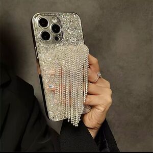 This stunning phone case is designed for the iPhone 16 Pro Max, featuring a glittery silver background that shimmers and catches the light. The highlight of this case is a dazzling heart-shaped embellishment adorned with rhinestones, with long, cascading tassels adding a touch of glamour and elegance.