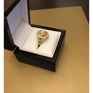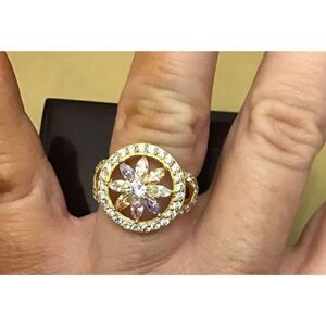 ON SALE! This sparkling sunburst design beauty features 4 carats of marquise and round cut pastel pink, lavender, champagne, and white topaz gemstones. It is done in a buttery 18k yellow gold plate finish and is size 8.
