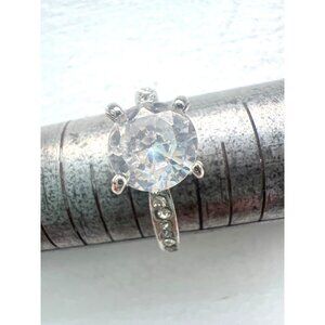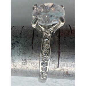 Sparkly high-quality Engagement-type or Promise Ring is an exquisite blend of platinum, white gold, and silver tones. Its size 9.75 prong-set round stone design radiates with cubic zirconia brilliance, offering a classic yet realistic look. High-quality construction. Great Promise ring - holds up when worn with real diamonds as shown in one of the photos.