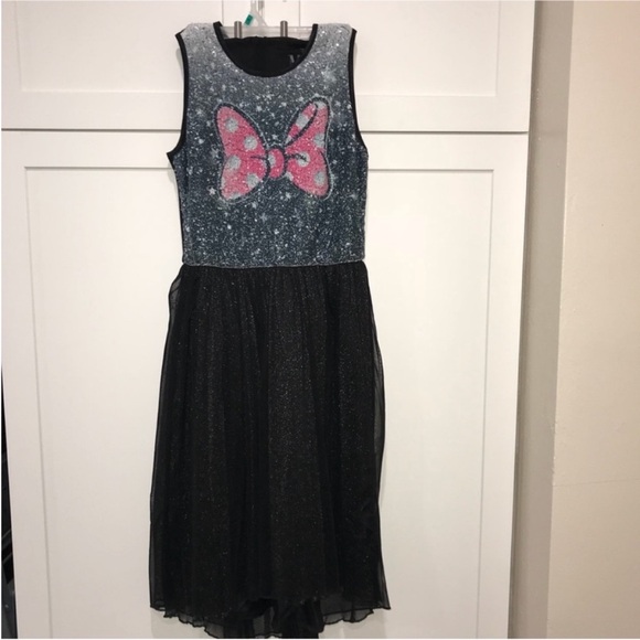 This charming kids dress features a sparkly black design with a cute pink bow detail. Perfect for special occasions.