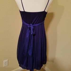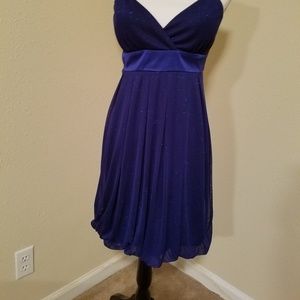 This dress is very fun for any special occasion or an intimate date dress. Dress is fully lined with padded cups in the breast. Silver and rhinestone accents on the straps for added sex appeal. The fabric is 100% polyester and a royal blue with a sparkle in it to shine in any dance floor. Size is a medium and measures 34" from top of strap to bottom of bubble hemline. Ties in back under breastline where the band is and the band actually measures 15" across lying flat. Dress fits like a size 3/4.