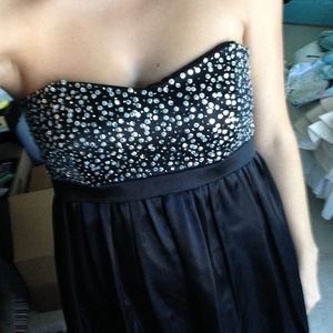 Worn once! Very cute/flattering silky black dress with embroidered sequin top and bubble skirt. No bra needed as there is built in support with adjustable clip inside ✨ size 6/medium