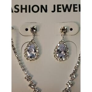 This is a very pretty necklace, and earrings set. It has lots of sparkly clear rhinestones set in silver tone metal. The main part of the necklace is approximately 16" long and covered with rhinestones. It has an additional 6-inch extender. It has a teardrop shaped pendant that drops another 0.75 " and matching dangle earrings that drop about 1 inch long. This set is new on the original card and in excellent condition.