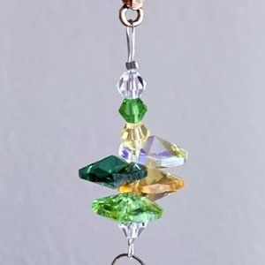 This is a beautiful suncatcher featuring a cast gold tone metal bee. The bee is embellished with clear, green, yellow and black crystals. It's body is a golden crystal. The bee hangs from a flower decorated with a faux pearl bead and four clear crystals. Below the bee are more crystals in green, clear and yellow, leading to a large iridescent, faceted prism. Put it anywhere the sun's rays will catch it and watch the beautiful colors refract from the crystals and large prism! Very pretty!