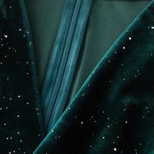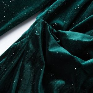 Sparkly Deep Green Velvet Deep V High Slit Midi Dress Long Sleeve