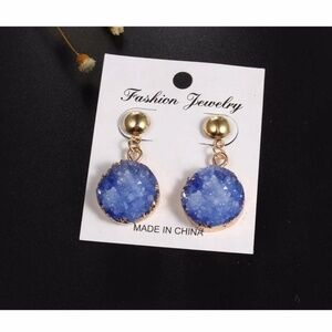 Blue Sparkly Druzy Round Dangle Earrings. Quartz Colorful Resin Stone