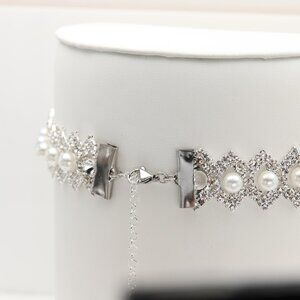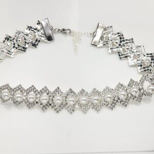Sparkly Fancy White Stone & Pearl Choker Necklace Adjustable White Rhinestone Ch