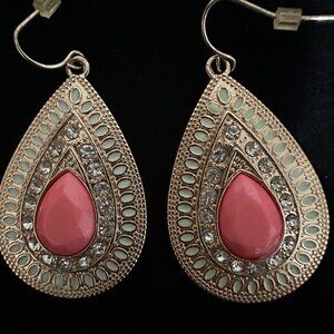 Elevate your look with these stunning and perfect condition gold-tone water drop dangle earrings! These eye-catching earrings feature a beautiful teardrop shape, intricately designed with a vibrant central pink/coral stone, surrounded by sparkling clear rhinestones, and framed by a delicate light green and diamond-like border. The brilliant rhinestones and details truly sparkle and catch the light with every movement, adding a touch of glamorous shine to any outfit, from everyday wear to special occasions. Lightweight and comfortable for all-day wear.