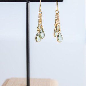 Beautiful earrings with green amethyst gemstones - light shines through. 18K gold over stainless steel hook (hypoallergenic). Unique jewelry, handmade, new.