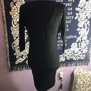 Guess- Get ya groove on in this sparkly shoulder and bust sweater dress. 35" long. Slight cowl at neck. Band at bottom to get that bloused effect. Lined with attached satin feel cami dress.