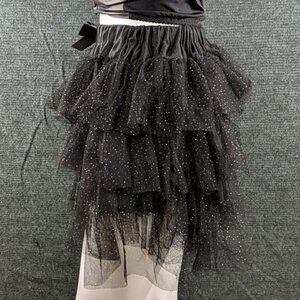 Black mesh with embedded glitter, 4 tiered ruffles attached to a soft, satiny miniskirt. Elastic waistband with bow at the front.