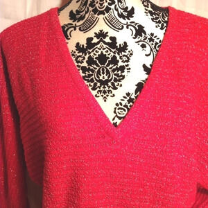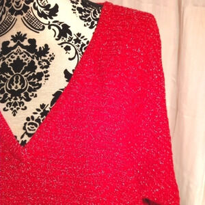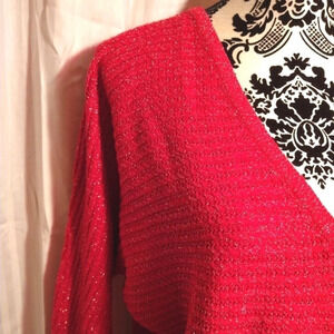 Bright shimmy red sweater with a v neckline and a scooped hemline. Tunic style. Says XXL but fits like a 1X.