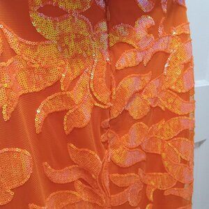 This is a striking orange color, covered in sequins. One shoulder with cut out middle. Never worn.