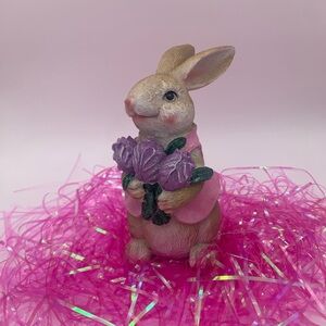 The Sparkly Pink Easter Bunny 8" Statue is a collectible Rabbit Statue made of resin, manufactured in the 1990s. It features a cute bunny holding a bouquet of purple flowers, making it a perfect decoration for Easter, Spring, or Summer. The statue's playful design and vibrant colors, such as pink and purple, and pastel colors featuring a glittery accent. Add a festive touch to any holiday or seasonal display.