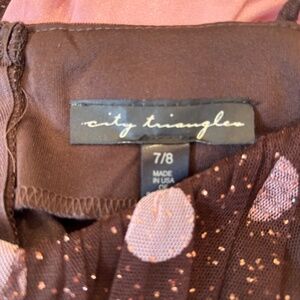 Polkadot sparkle netted cover over brown liner dress with wide satin pink sash. Hidden zip in back.