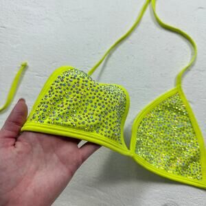 this rhinestone bikini top features a bright neon yellow base covered in shimmering crystals for a bold, eye-catching look. adjustable tie straps make it easy to customize your fit — perfect for pool parties, photoshoots, or festival outfits.