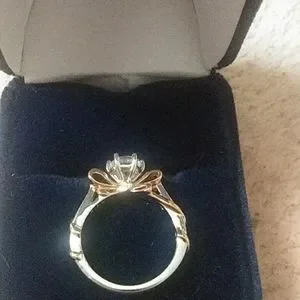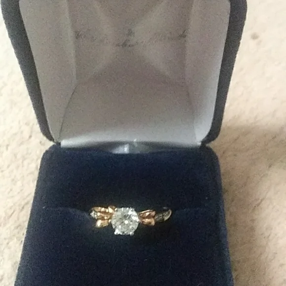 Very cute. Rose gold plated ribbon wraps around ring. With small sparkly stones, and one bigger stone in middle. Sterling silver. New, Never worn. Comes in original box.